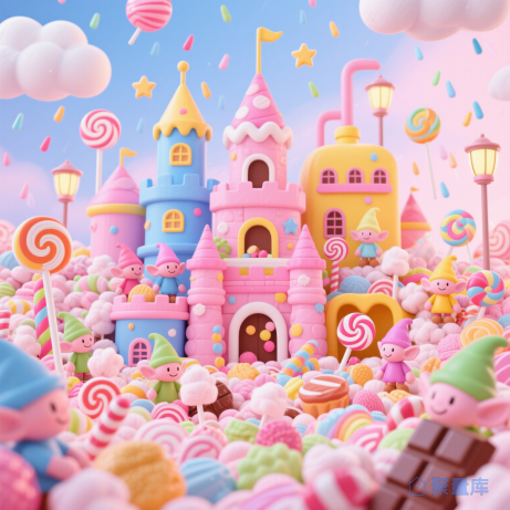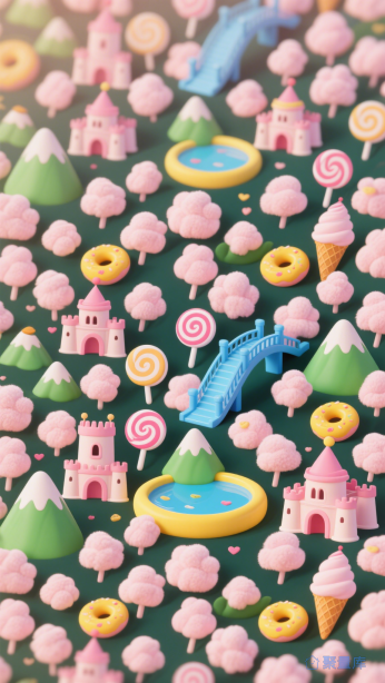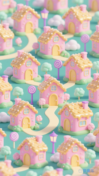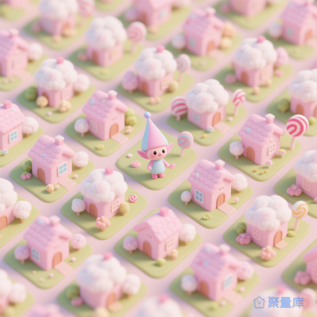 聚量库AIGC作品:《四方连续图粉色糖果小屋村》